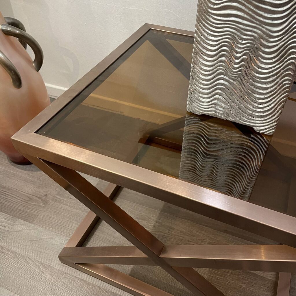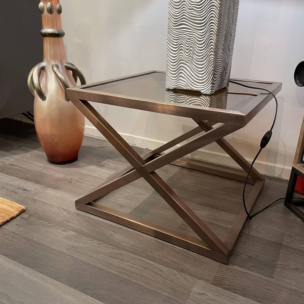 alt="Bout de canapé plateau en verre et structure en métal cuivré" title="Bout de canapé plateau en verre et structure en métal cuivré"/>