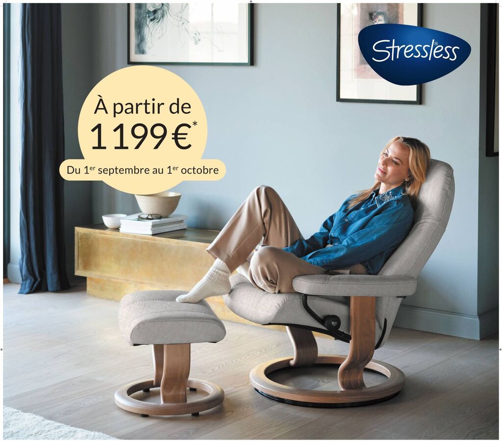 -400€ pour l’achat d’un ensemble fauteuil et repose-pieds quel que soit son piétement, d’un fauteuil Power ou Office des modèles suivants : Stressless Consul, Sunrise et Mayfair dans tous les revêtements et coloris.